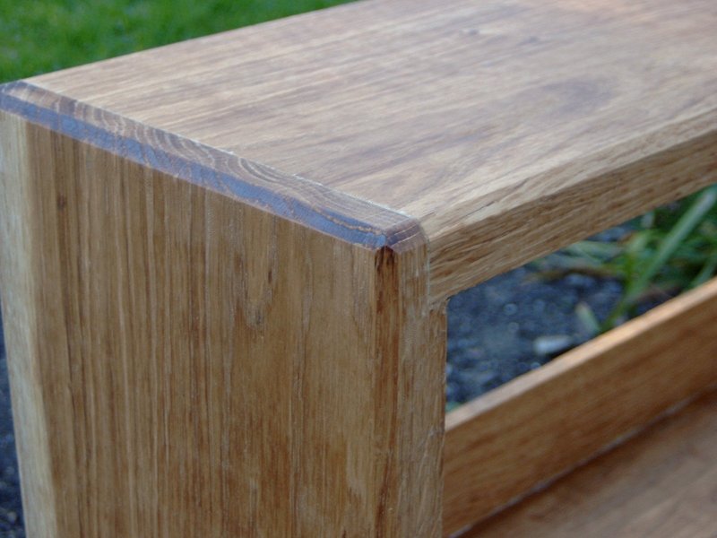 All corners are 45 degree bevelled or roundover and the finish is a teak oil, it's a shame to spoil such a nice timber with a stain or varnish.