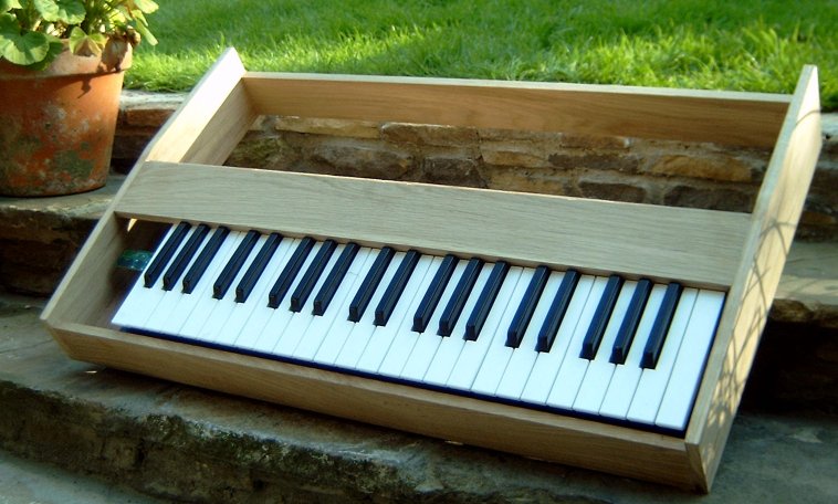 Keyboard now 3 1/2 octaves and mounted in cabinet, front strip also added.